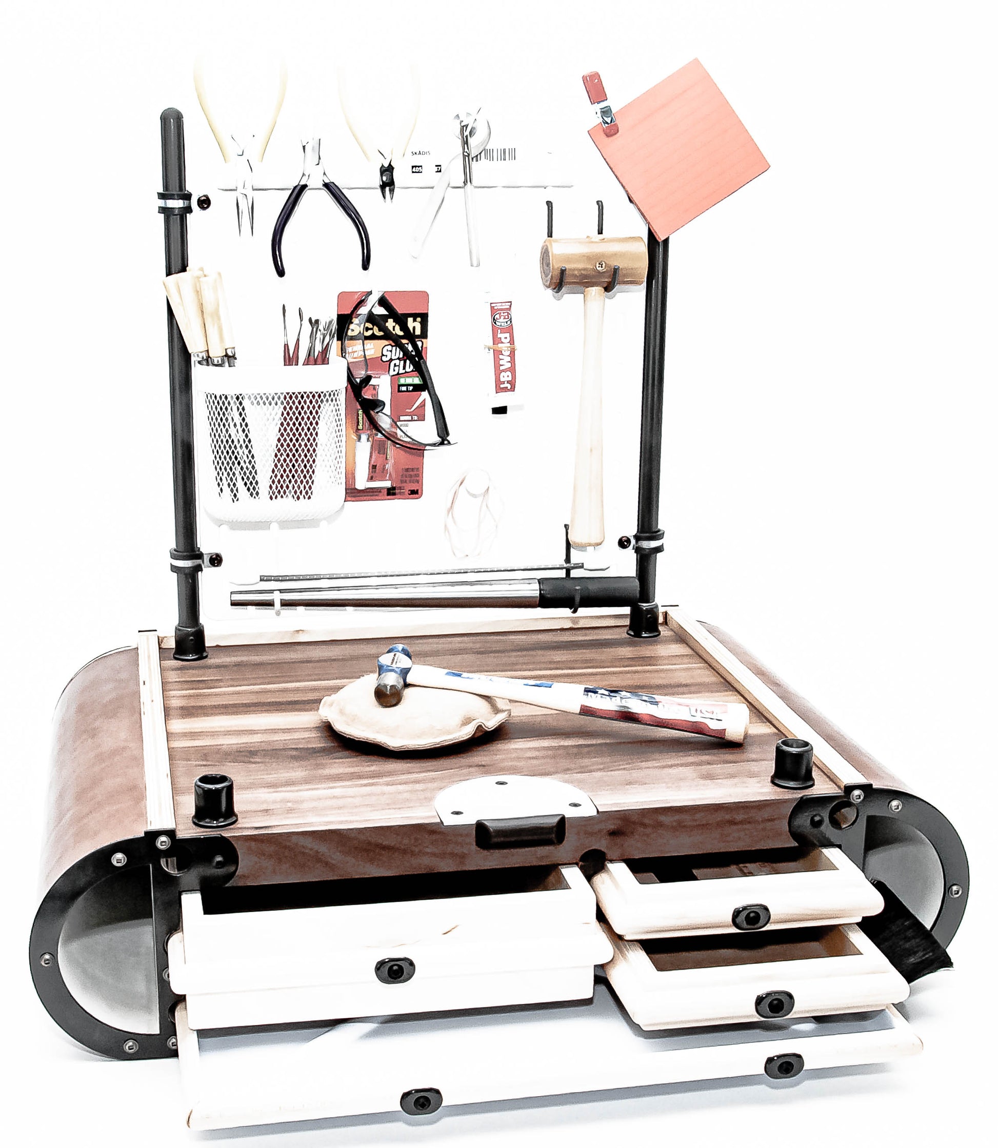 A pair of round tubular stanchion expands the overall work space while maintaining it's base footprint. Effortlessly facilitates and integrates a variety of additional attachments such as lighting, magnifiers, protective shields and swivel trays. Additionally the set of stanchion posts can be integrated with a compatible slat wall system to help organize various hand tools and work supplies.